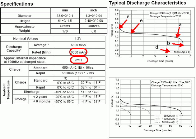 На этом рисунке показаны подробные параметры, извлеченные из спецификации батареи Panasonic NiMH-HHR650D.