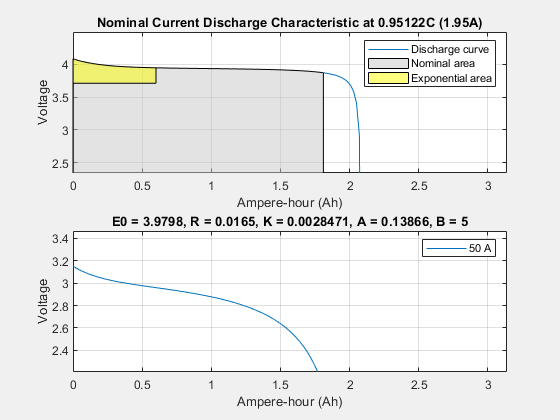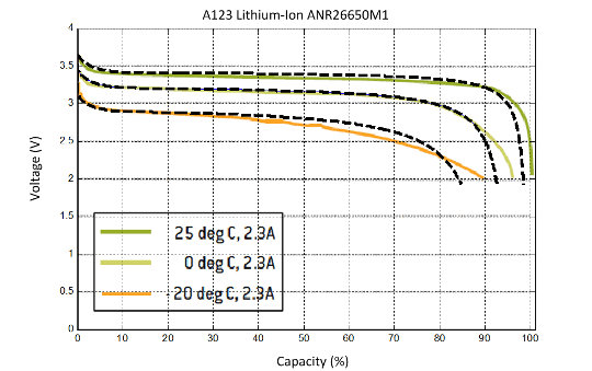 Для представления температурных эффектов типа литий-ионной (Li-ионной) батареи требуется дополнительная кривая разрядки при температуре окружающей среды, которая отличается от номинальной температуры, и параметры термического отклика. Дополнительные кривые разрядки обычно не приводятся в листе данных и могут потребовать проведения простых экспериментов. Следующие примеры показывают параметры, извлеченные из A123 Li-железо-фосфат ANR26650M1 и Panasonic Li-кобальт-оксид CGR 18,650 AF аккумуляторной батареи.