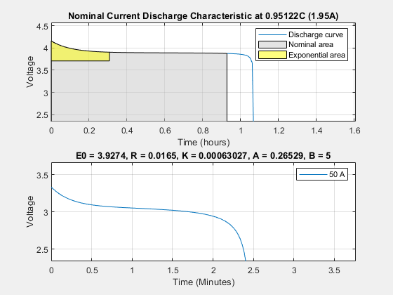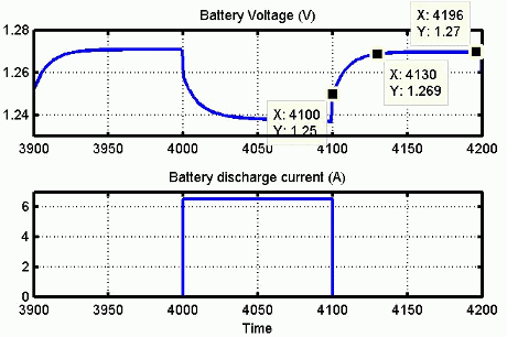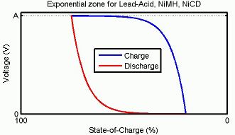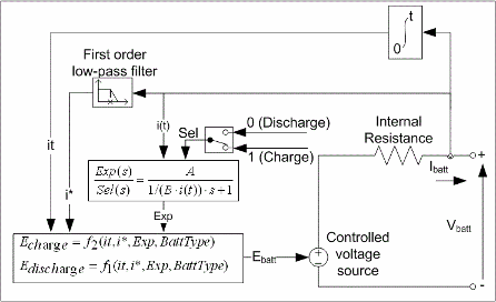 Передаточная функция Exp (s) представляет явление гистерезиса для свинцово-кислотных, никель-кадмиевых (NiCD) и никель-металлгидридных (NiMH) батарей во время циклов зарядки и разрядки. Экспоненциальное напряжение увеличивается при зарядке батареи, независимо от состояния заряда батареи. Когда батарея разряжается, экспоненциальное напряжение немедленно уменьшается.