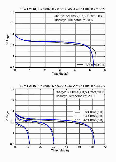 На чертеже пунктирные линии показывают кривые разрядов, полученные при моделировании при различных температурах окружающей среды. Производительность модели очень близка к результатам технических характеристик.