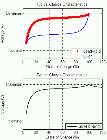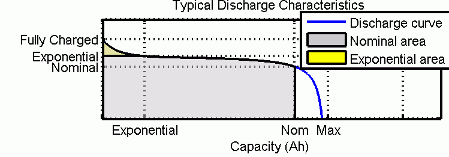 Первая секция представляет экспоненциальное падение напряжения при зарядке батареи. Ширина капли зависит от типа батареи. Вторая секция представляет заряд, который может быть извлечен из батареи до тех пор, пока напряжение не упадет ниже номинального напряжения батареи. Наконец, третья секция представляет полный разряд батареи, когда напряжение быстро падает.