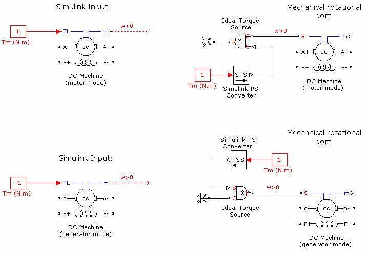 Для машины постоянного тока с намотанным полем обеспечивается доступ к полевым терминалам (F +, F −), так что модель машины может использоваться в качестве машины постоянного тока с шунтированным или последовательным подключением. Крутящий момент, приложенный к валу, обеспечивается на входе Simulink ® TL.