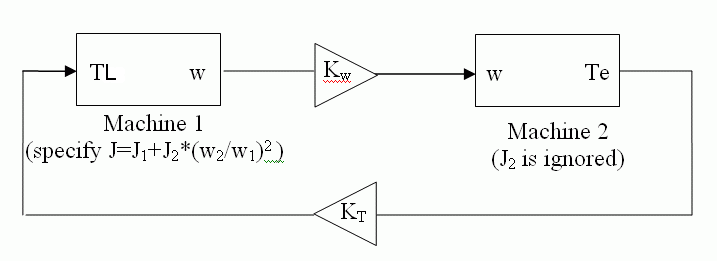 На следующем рисунке показано, как моделировать жесткое соединение вала в электродвигателе-генераторе. Выход скорости машины 1 (двигателя) соединен с входом скорости машины 2 (генератора), а выход электромагнитного крутящего момента Те машины 2 приложен к входу крутящего момента механической нагрузки ТЛ машины 1. Коэффициент Kw учитывает единицы скорости как машин (рад/с), так и передаточное число коробки передач. Коэффициент KT учитывает единицы крутящего момента как машин (N.m), так и номинальных параметров машин. Кроме того, поскольку инерционный J2 игнорируется в машине 2, J2, упоминаемая скорость машины 1, должна быть добавлена к инерционному J1 машины 1.