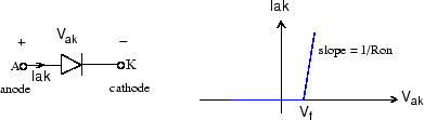 Диод представляет собой полупроводниковый прибор, который управляется собственным напряжением Vak и током Iak. Когда диод смещен вперед (Vak > 0), он начинает проводить через него небольшое напряжение Vf вперед. Он отключается, когда поток тока в устройство становится равным 0. Когда диод смещен в обратном направлении (Vak < 0), он остается в выключенном состоянии.