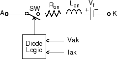 Диодный блок моделируется резистором, индуктором и источником постоянного напряжения, включенным последовательно с выключателем. Работа переключателя управляется напряжением Vak и током Iak.