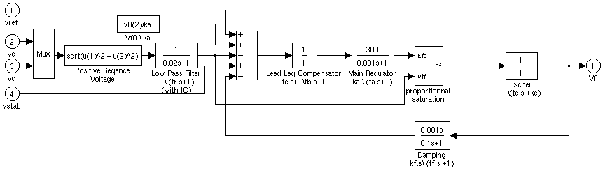 Возбудитель представлен следующей передаточной функцией между напряжением возбудителя Vfd и выходом регулятора ef: