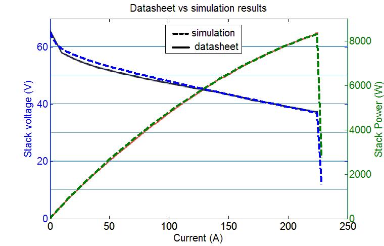 При указанных выше параметрах поляризационная кривая дымовой трубы, работающая при фиксированной номинальной скорости преобразования газов, закрывается кривыми таблицы данных, как показано ниже: Синяя пунктирная линия показывает, что смоделированное напряжение дымовой трубы и зеленая пунктирная линия показывают смоделированную мощность дымовой трубы.
