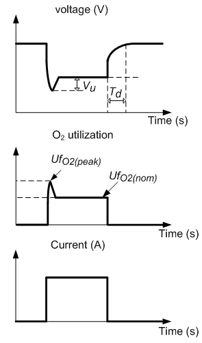 Текущие тесты шага и прерывания должны быть выполнены на реальном стеке, чтобы с точностью представить его динамику. На рисунке ниже показана реакция стека от этих тестов и требуемые параметры (Td, UfO2 (пик) и Vu).