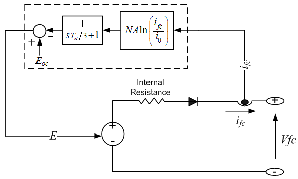 Эта модель основана на эквивалентной схеме батареи топливных элементов, показанной ниже: