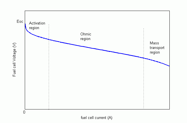 Первая область представляет собой падение напряжения активации из-за медленности химических реакций, происходящих на поверхностях электродов. В зависимости от температуры и рабочего давления, типа используемого электрода и катализатора эта область является более или менее широкой. Вторая область представляет резистивные потери из-за внутреннего сопротивления батареи топливных элементов. Наконец, третья область представляет потери в массовом переносе в результате изменения концентрации реагентов при использовании топлива.