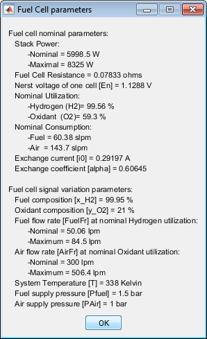 Время отклика (Td) зависит от самой батареи топливных элементов и обычно указывается в листе данных. Параметры динамики потока (UfO2 (пик) и Vu) зависят от динамики внешнего оборудования (компрессора, регулятора и нагрузок) и не предоставляются производителями, так как их значения изменяются в зависимости от применения пользователем. При моделировании следует принимать значения UfO2 (пиковые) от 60% до 70% и Vu от 2 до 5% номинального напряжения батареи.