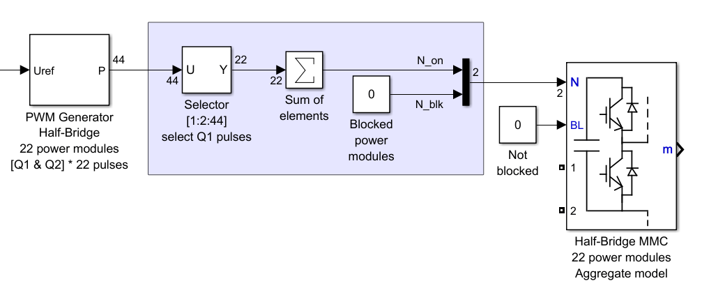 Блок Half-Bridge MMC реализует полумостовой модульный многоуровневый преобразователь. Преобразователь состоит из нескольких последовательно соединенных модулей питания. Каждый модуль питания состоит из одного полумоста и одного конденсатора на стороне постоянного тока.