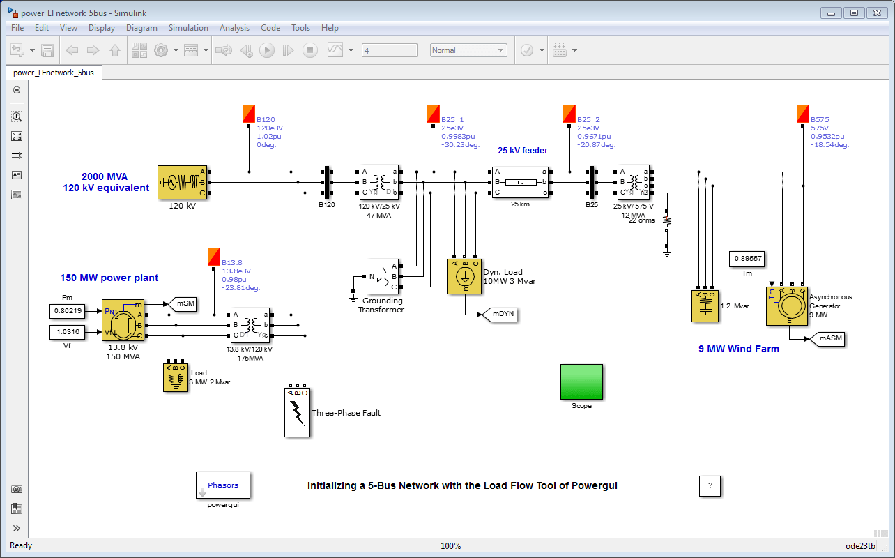 После получения удовлетворительного потока нагрузки обновите исходные условия модели в соответствии с решением по потоку нагрузки. Нажмите кнопку Применить к модели (Apply to Model), чтобы инициализировать блоки машин модели и в качестве начальных условий регуляторов, подключенных к машинам.