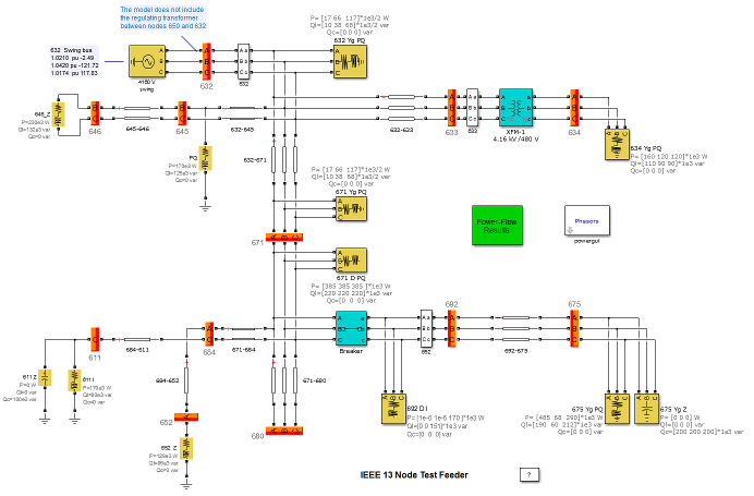 В командной строке введите power_13NodeTestFeeder открытие модели, содержащей 12 блоков шины потока нагрузки и 13 блоков потока нагрузки. Эта модель является эталонной сетью, взятой из радиального тестового питателя в отчете подкомитета по анализу распределительной системы Общества энергетики на страницах 908-912, написанном в 2001 году.