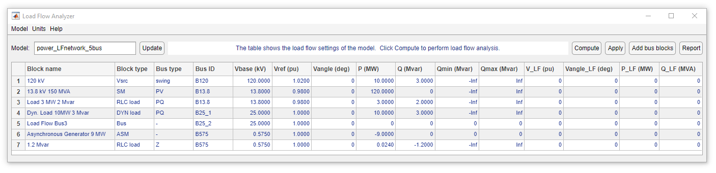 После ввода параметров потока нагрузки в блоках шины потока нагрузки и в различных блоках потока нагрузки откройте анализатор потока нагрузки, нажав кнопку Load Flow Analyzer блока powergui. Инструмент отображает сводку данных потока нагрузки модели. В таблице ниже показаны данные, найденные в power_LFnetwork_5bus модель.
