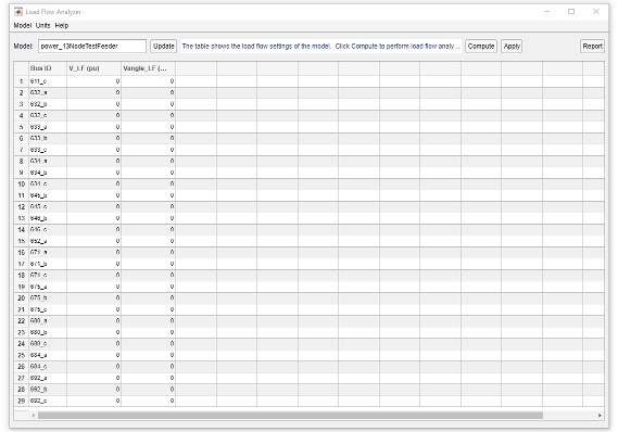 Откройте Load Flow Analyzer, нажав кнопку Load Flow Analyzer в блоке powergui. Инструмент отображает список отдельных однофазных шин (по одной шине на фазу), найденных в power_13NodeTestFeeder модель. В анализаторе потока нагрузки поток нагрузки еще не был выполнен, поэтому в столбцах V_LF (pu) и Vangle_LF (deg) отображаются нулевые значения.