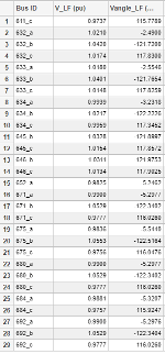 Столбец Имя блока определяет тип блока. В столбце Тип блока отображается тип шины блоков потока нагрузки. Следующие четыре столбца дают идентификационную метку шины, базовое напряжение шины, опорное напряжение (в pu базового напряжения) и угол напряжения шины потока нагрузки, к которой подключен блок. Следующие столбцы являются значениями P и Q, заданными на вкладке «Поток нагрузки» блоков.