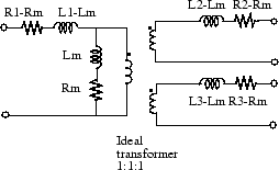 При моделировании индуктивностей с двумя или тремя обмотками с одинаковой взаимной связью задаются самоустойчивость и индуктивность каждой обмотки плюс взаимное сопротивление и индуктивность. Электрическая модель для этого блока в данном случае приведена ниже: