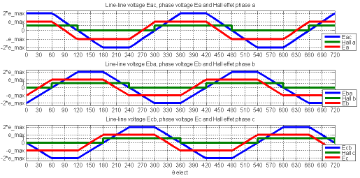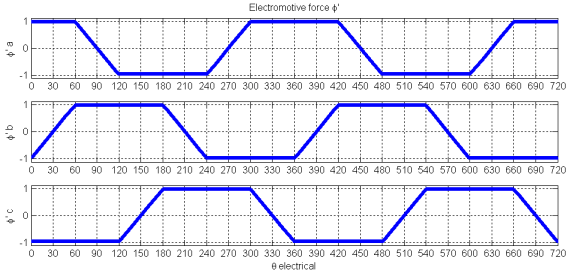 Трапециевидная модель предполагает, что распределение обмоток и поток, установленные постоянными магнитами, создают три трапециевидных задних сигнала ЭДС.