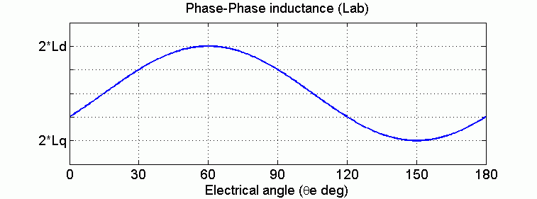 Индуктивности Lq и Ld представляют соотношение между фазовой индуктивностью и положением ротора вследствие солености ротора. Например, индуктивность, измеренная между фазами А и В (когда фаза С остается открытой), определяется следующим образом: