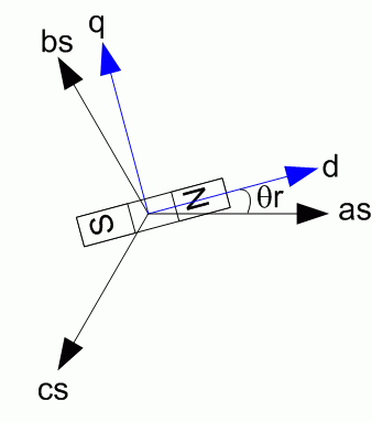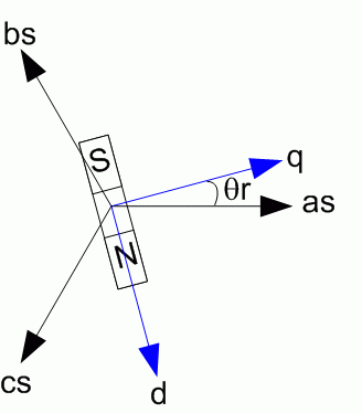 Эти уравнения выражаются в фазовом опорном кадре (abc-кадре). Следует отметить, что фазовая индуктивность Ls считается постоянной и не изменяется в зависимости от положения ротора.