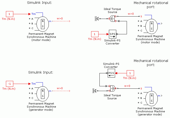 Блок синхронной машины с постоянным магнитом работает в режиме генератора или двигателя. Режим работы диктуется признаком механического крутящего момента (положительный для режима двигателя, отрицательный для режима генератора). Каждая электрическая и механическая часть машины представлена моделью пространства состояния второго порядка.