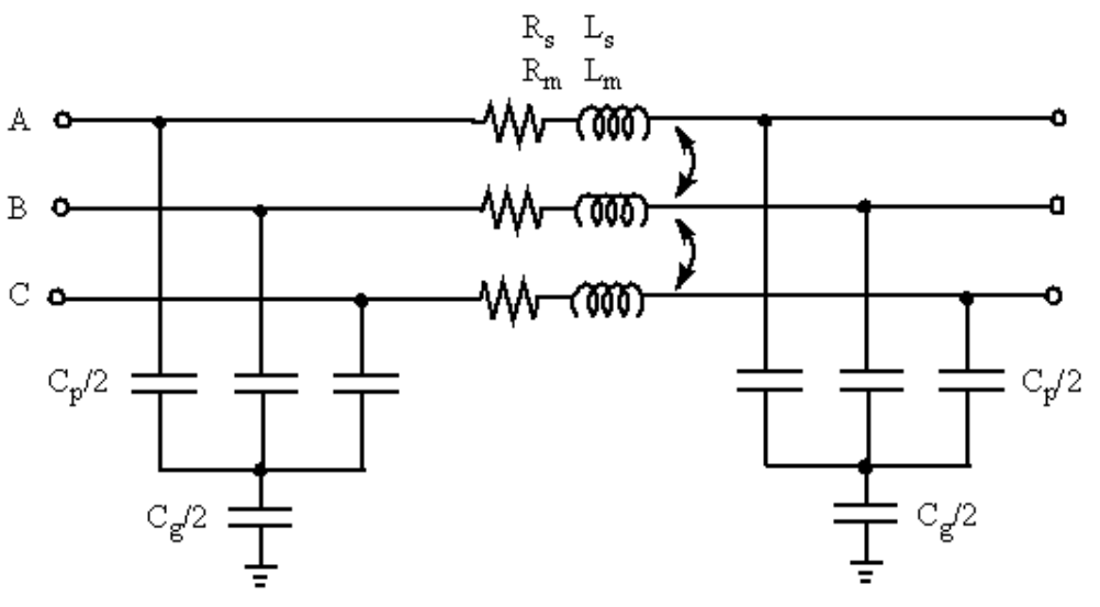 Для линии передачи сопротивление, индуктивность и емкость равномерно распределены вдоль линии. Приблизительная модель линии распределенных параметров получается путем каскадирования нескольких идентичных секций PI. На следующем рисунке показан один участок PI трехфазной линии передачи.