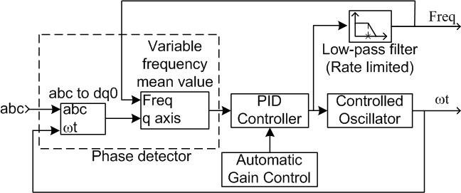 Трехфазный входной сигнал преобразуется во вращающийся кадр dq0 (преобразование Парка) с использованием угловой скорости внутреннего генератора. Квадратурная ось сигнала, пропорциональная разности фаз между сигналом abc и рамкой вращения внутреннего генератора, фильтруется блоком средней (переменной частоты). Контроллер пропорциональной интегральной производной (PID) с опциональным автоматическим регулированием усиления (AGC) поддерживает разность фаз равной 0, воздействуя на управляемый генератор. Выходной сигнал PID, соответствующий угловой скорости, фильтруется и преобразуется в частоту в герцах, которая используется средним значением.