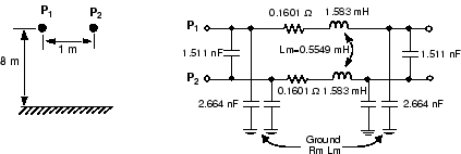 Первый пример использует простую линию, состоящую из двух проводников, разнесенных на 1 метр при средней высоте 8 метров над совершенным грунтом (удельное сопротивление на грунте startg = 0). Эти два проводника представляют собой сплошные алюминиевые проводники (удельное сопротивление δ c = 28,3 10 − 9 Λ .m при 20 ° C), имеющие диаметр 15 мм.