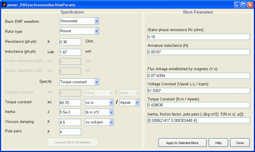spec.backEMF = 'sinusoidal'; spec.rotorType = 'round' ; spec.R = 0.36; spec.Lab = 1.67; spec.suppliedConstant = 'torque'; spec.k = 60.70; spec.kUnitsNum = 'oz.in'; spec.kUnitsDenom = 'Apeak'; spec.J = 5.5e-3; spec.inertiaUnits = 'lb.in.s^2' ; spec.F = 4.5; spec.frictionUnits = 'oz.in/krpm'; spec.p = 4; params = power_PMSynchronousMachineParams(spec)