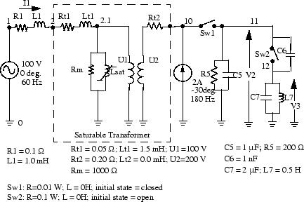 Следующая схема состоит из двух источников (один источник напряжения и один источник тока), двух последовательных ответвлений RLC (R1-L1 и C6), две параллельные ветви RLC (R5-C5 и L7-C7), один насыщаемый трансформатор и два переключателя (Sw1 и Sw2). Sw1 первоначально закрыт, тогда как Sw2 первоначально открыт. Задаются три выхода измерения (I1, V2 и V3). Эта схема имеет семь узлов с номерами 0, 1, 2, 2.1, 10, 11 и 12. Узел 0 используется для заземления. Узел 2.1 - внутренний узел трансформатора, к которому подключена ветвь намагничивания.