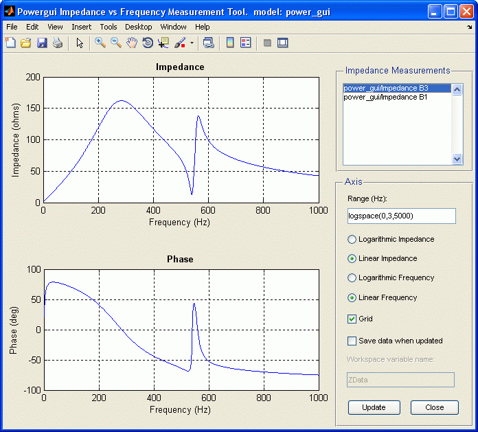power_zmeter('sys') открывает диалоговое окно Инструмент измерения импеданса против частоты (Impedance vs Frequency Measurement Tool) для отображения зависимости импеданса от частоты, определенной блоками измерения импеданса. Этот инструмент также можно активировать в диалоговом окне блока Powergui, выбрав значение «Импеданс против измерения частоты».