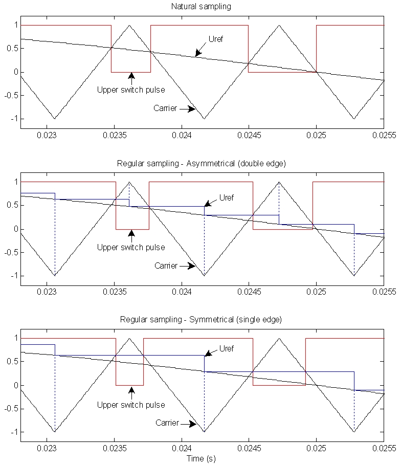 На рисунке описаны три способа выборки опорного сигнала Uref. Метод естественной выборки моделирует поведение аналоговой реализации генератора ШИМ. Используя два обычных метода отбора проб, Uref может быть взят дважды как в долине, так и на пике носителя или только один раз в долине носителя. Первая называется асимметричной выборкой или двухкраевой техникой. Последний называется симметричной выборкой или однокраевой техникой.
