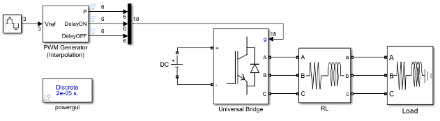 Блок может управлять коммутационными устройствами с двухквадрантными преобразователями, однофазными полнофазными мостами, двухуровневыми трехфазными мостами или трехуровневыми трехфазными мостами. Опорный сигнал на порте Vref, также называемый модулирующим сигналом, сравнивается с симметричной несущей треугольника. Когда опорный сигнал больше несущей, импульс для верхнего переключающего устройства является высоким (1), а импульс для нижнего устройства является низким (0). Генератор использует этот метод униполярной модуляции для независимого управления каждой рукой. Второй опорный сигнал генерируется внутри путем фазового сдвига исходного опорного сигнала на 180 градусов.