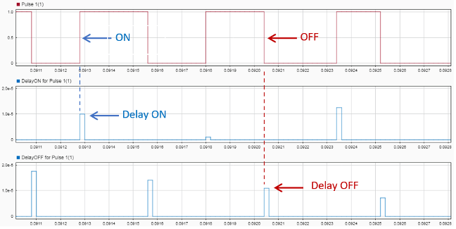 Каждый раз, когда импульсный сигнал входит в состояние включения, DelayOn выдает значение, которое соответствует точной временной задержке между этапом вычисления и моментом, когда импульс вошел в on состояние. На рисунке сигнал Pulse 1 поступает в on состояние через 0,09128 секунды (показано синей стрелкой). В этот же момент выходной сигнал DelayOn для импульса 1 составляет 1e-5 секунд. Следовательно, точное время, когда импульс 1 вошел в on состояние составляет 0,09128-1e-5 = 0,09127 секунды.