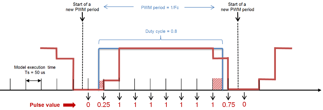 Генератор выдает импульсное значение, используя метод модуляции на основе несущей с естественной выборкой. Если переход происходит в пределах времени выборки, генератор выводит значение импульса, представляющее отношение времени (значение между 0 и 1) для on состояние в течение времени выборки. Например, в момент времени выборки, определяемый первой синей стрелкой, генератор выдает значение 0,25, которое представляет, что введенный импульс on при 0,25 * Ts секунд (это былоon в течение 25% времени выполнения модели). Смещение представлено красной штриховой областью. Аналогично, во время выборки, обозначенное второй синей стрелкой, генератор выдает значение 0,75, которое представляет, что импульс был включен в течение 75% времени выполнения модели (он вошел в состояние выключения 0,75 * Ts секунд после предыдущего времени выборки).