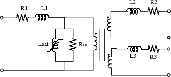 Модель учитывает сопротивления обмотки (R1 R2 R3) и индуктивности утечки (L1 L2 L3), а также намагничивающие характеристики сердечника, которые моделируются сопротивлением Rm, моделирующим активные потери сердечника и насыщаемую индуктивность Lsat.
