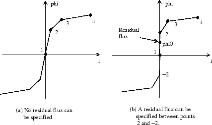 Поэтому, если требуется задать остаточный поток, phi0, вторая точка характеристики насыщения должна соответствовать нулевому току, как показано на рисунке (b).