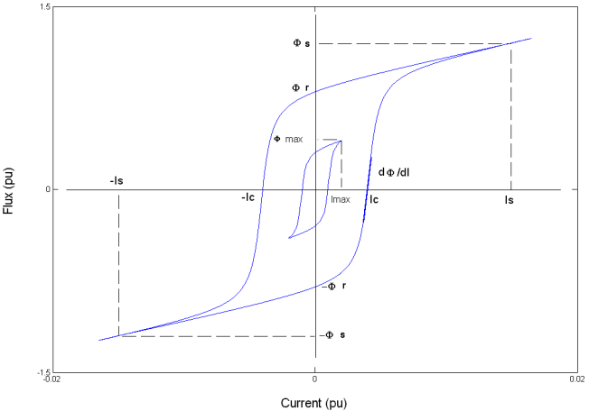 Намагничивающий ток I вычисляется из потока, полученного интегрированием напряжения на намагничивающей ветви. Статическая модель гистерезиса определяет отношение между потоком и током намагничивания, оцениваемым в постоянном токе, когда потери вихревого тока отсутствуют.