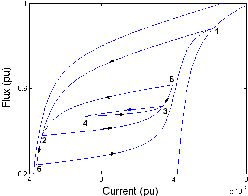 В переходных условиях колебательный намагничивающий ток создает незначительные асимметричные петли, как показано на следующем рисунке, и предполагается, что все точки работы находятся в пределах основной петли. Некогда замкнутые петли больше не влияют на последующую эволюцию.