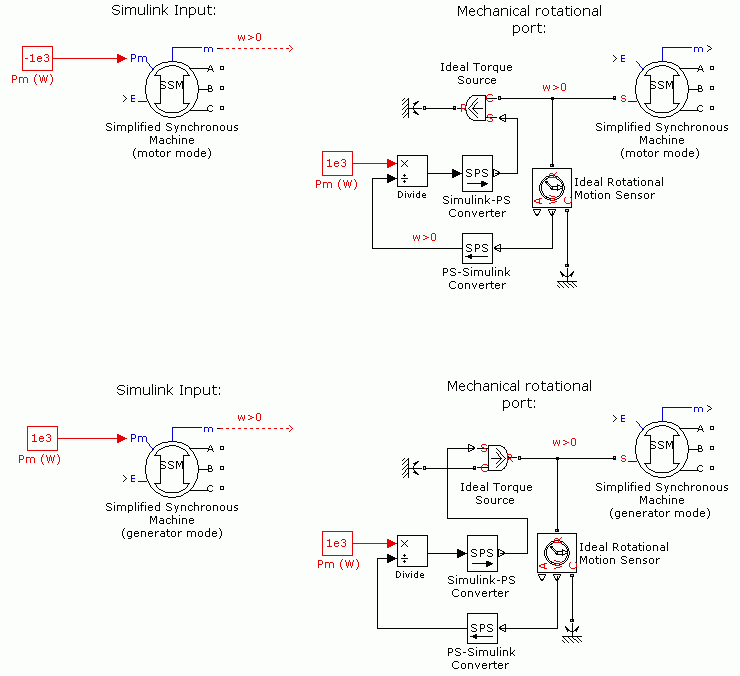 В библиотеке станков можно выбрать единицы СИ или блоки упрощенного синхронного станка для задания электрических и механических параметров модели. Эти два блока моделируют точно такую же упрощенную модель синхронной машины; единственное отличие заключается в том, как вводятся единицы измерения параметров.