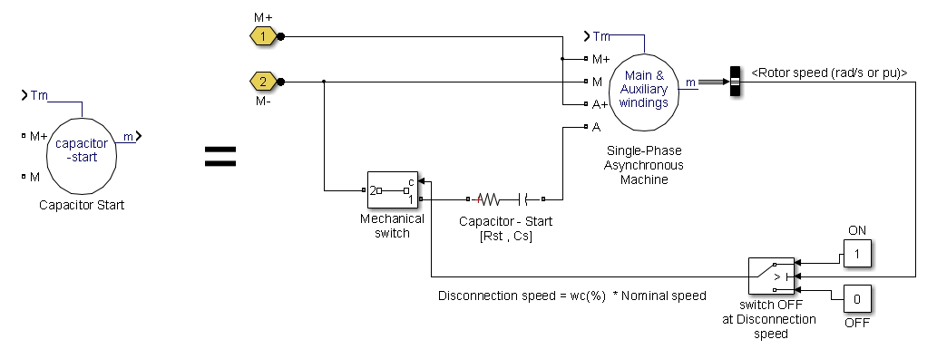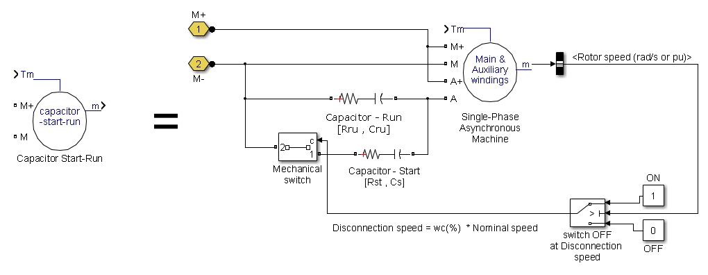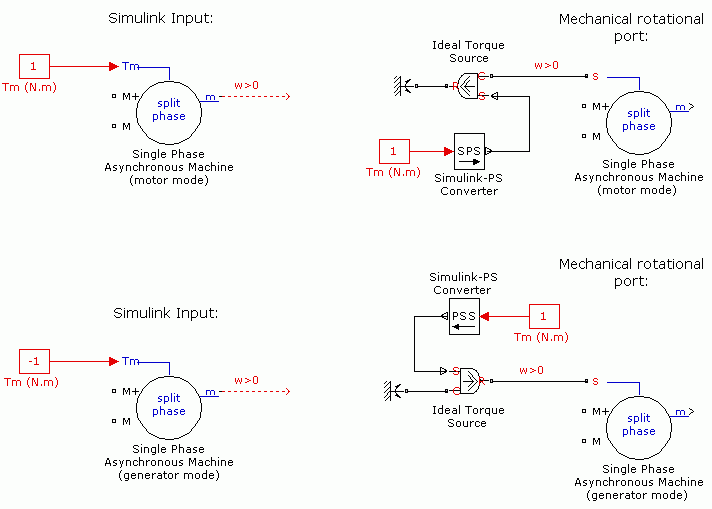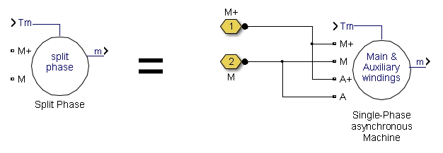 Эта машина имеет две обмотки: основную и вспомогательную. С моделью Вы можете моделировать расщепленную фазу, конденсаторное начало, конденсаторный конденсатор начала управляемые, и главные & вспомогательные рабочие режимы обмоток.