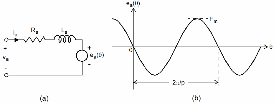 На этом рисунке показана эквивалентная схема для одной фазы в электродвигателе с постоянным магнитом (PM) или гибридном шаговом двигателе.