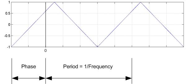 Блок Генератора Треугольника генерирует симметричную форму сигнала Треугольника, с пиковой амплитудой +/− 1. На рисунке показано, как параметры частотного и фазового блоков влияют на форму выходного сигнала.