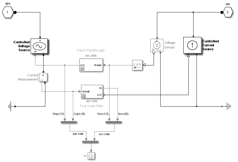 Блок измеряет напряжение между ssc порт и электрическая привязка Simscape и распространяет ее на sps порт, сохраняя полярность относительно электрического эталона Simscape Electric Specialized Power Systems. Блок также измеряет ток, входящий в sps порт и распространяет его на ssc порт.