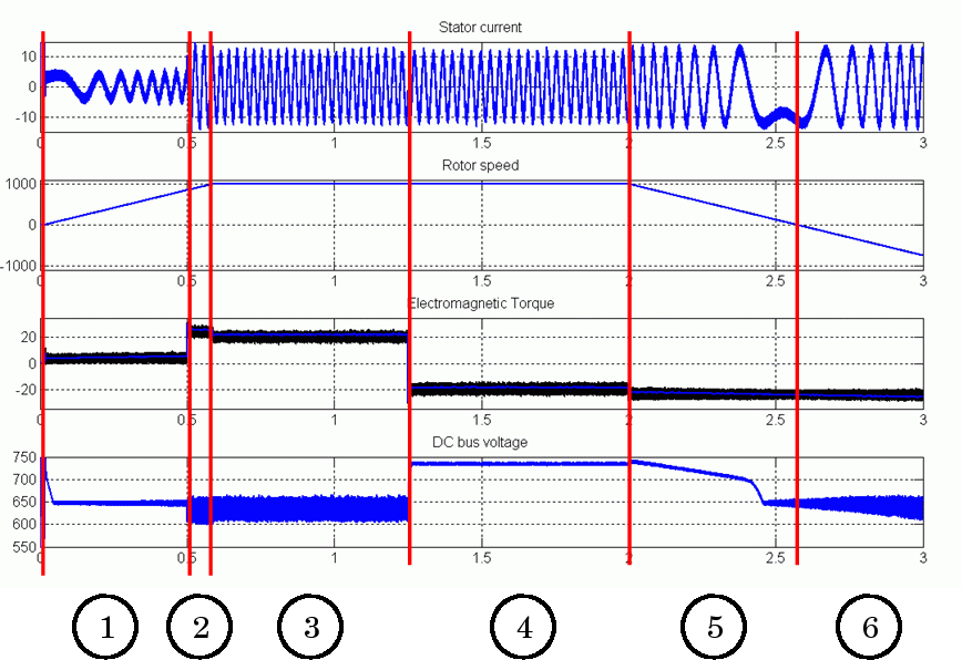 Электропривод мощностью 5 л.с. (3728 Вт) питается от трехфазного источника частотой 60 Гц. Среднее напряжение шины постоянного тока задается следующим образом: