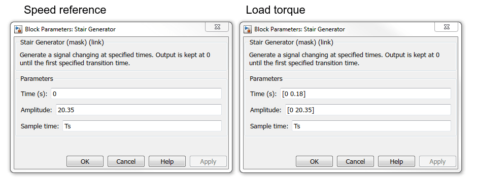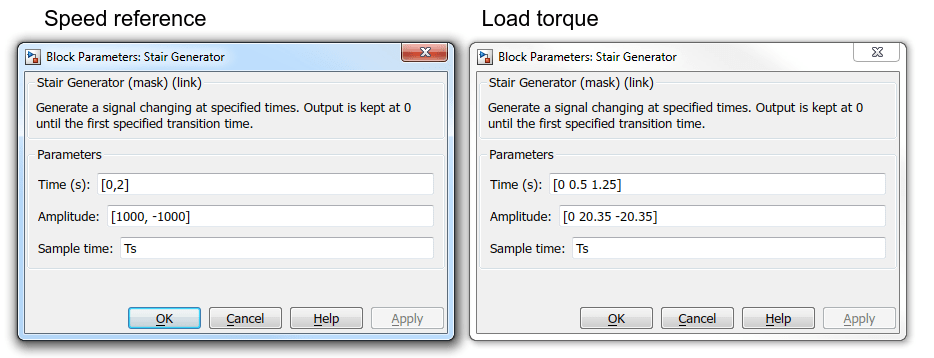 Чтобы применить номинальный крутящий момент к двигателю, измените параметры блоков генератора лестниц в подсистеме привязки скорости и в подсистеме нагрузки крутящего момента.
