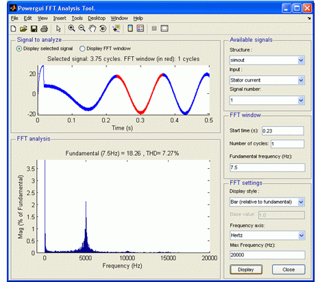 В списке «Ввод» выберите Stator current сигнал и установить Время запуска на 0.23, Количество циклов до 1, Основная частота до 7.5и максимальная частота (Гц) до 20000 Гц.