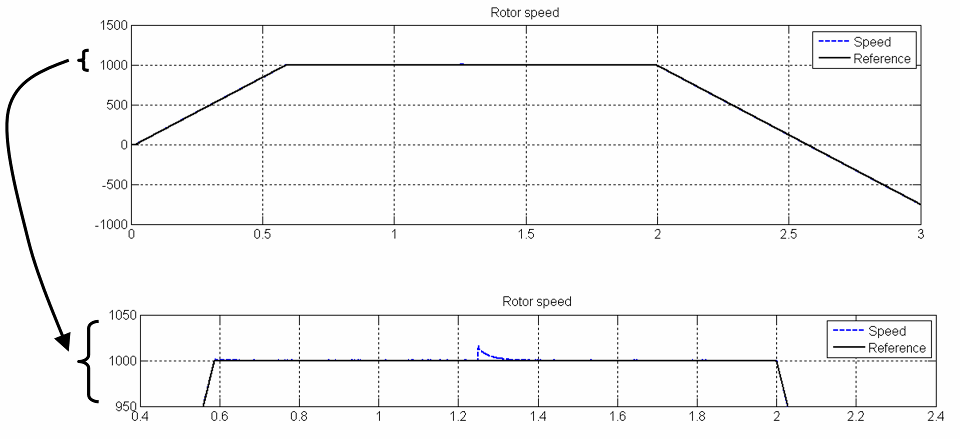 Постепенно увеличивайте параметр пропорционального усиления регулятора скорости и имитируйте его до тех пор, пока не получите удовлетворительное время отклика без превышения. Следует отметить, что если коэффициент усиления слишком высок, система будет колебательной. Следующий график основан на пропорциональном усилении 3.