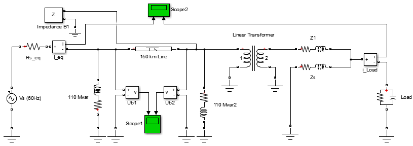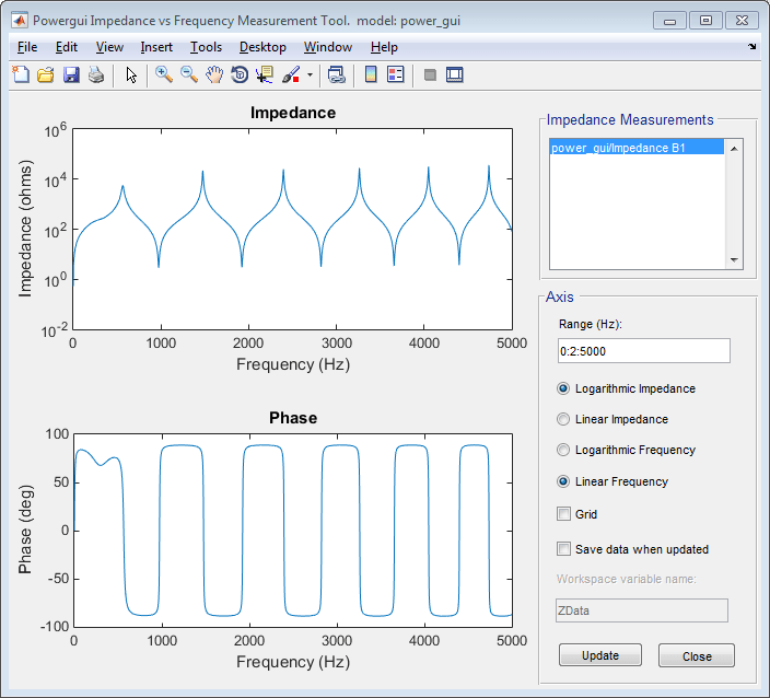 Библиотека Simscape > Electrical > Specialized Power Systems > Fundamental Blocks > Measurements содержит блок измерения импеданса, который измеряет импеданс между любыми двумя узлами цепи. В следующих двух разделах измеряется импеданс в модели power_gui с помощью двух методов.